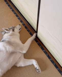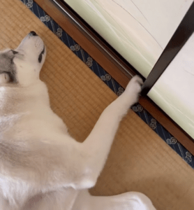 なんと、飼い主さんが和室から出ようとすると、アシㇼちゃんが前足でふすまを閉めて出られないようにしてきたのです。