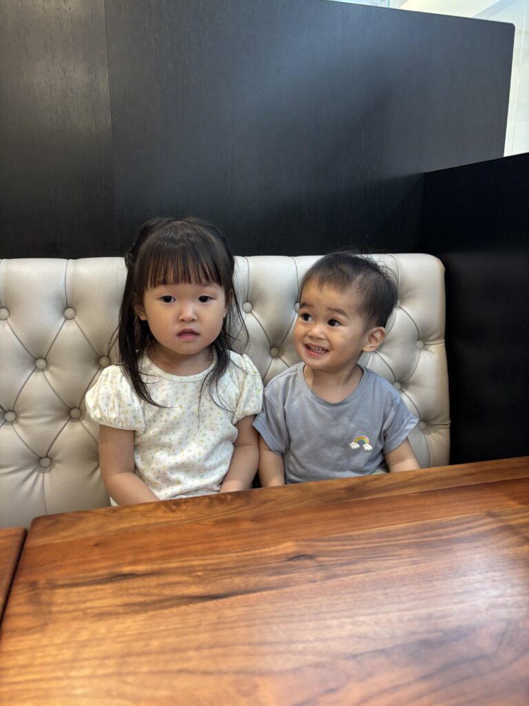 • パパに「ちょっと待って」と言われ、待機する2歳兄と10ヶ月娘。しかし直後、現れたパパの様子に「すんごいパリピww」「パパが1番楽しんでる」