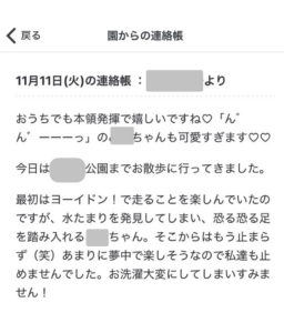 保育園の連絡帳には「楽しそうなので止められなかった」「お洗濯大変にしてしまいすみません!」などと書かれていました。