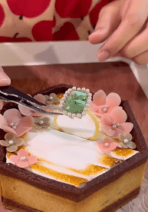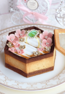 見た目のデザインは、構想段階でマシュマロがリングピローのように見えたことがきっかけでした。そこから発想を広げ、飴細工で指輪を作り、リングホルダー風のデザインに仕上げています。