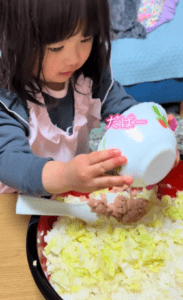 今回は、家族みんなが好きなサラダ巻きをイメージした『サラダ巻き風混ぜご飯』を作ることに。動画には、ツナや海苔などを楽しそうにご飯に混ぜていく娘さんが映っています。