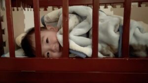 その姿は、まだ言葉を話さない月齢ながら、目と表情だけでしっかりと気持ちを伝えてくる姿が印象的です。息子さんは、ママさんが目を覚ますのを待つようにベッドの柵の隙間から覗き、寝起きのママさんに笑顔を向けました。
