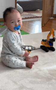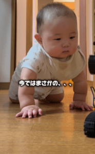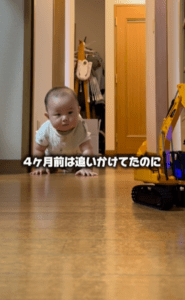 動画が撮影された当時、息子さんは生後7ヶ月でした。ハイハイが活発になり、部屋の中を自由に動き回れるようになってきた時期です。