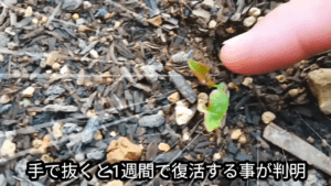 このときの実験では、1日目こそ3つの方法に大きな差は見られなかったものの、4日目には手で抜いた場所から早くも新しい芽が顔を出していました。