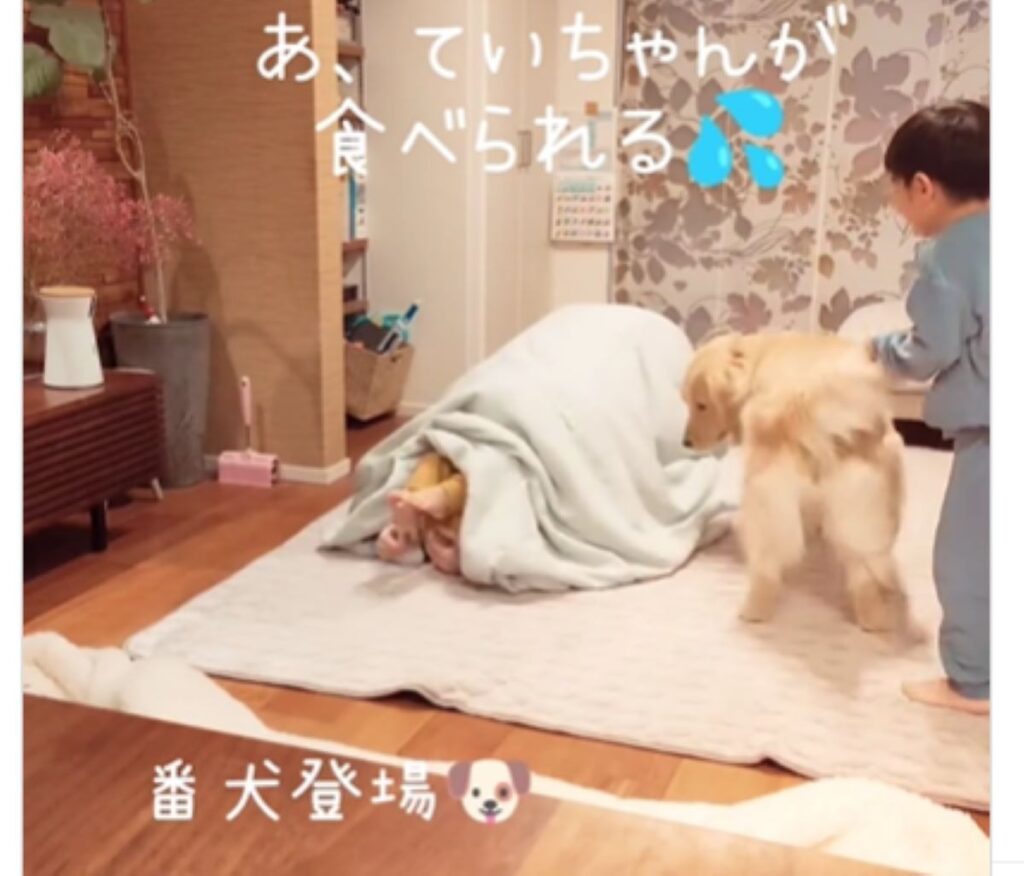 • 夜泣き中の10ヶ月息子。ぐずって愛犬に突撃するが…まさかの展開に「暖かそうなお布団」「さすが」