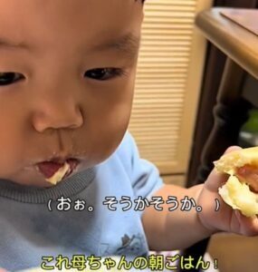 ソファでおにぎりを食べる1歳息子 しかしよく見ると…母「!?」すべてを察した母の投稿に「可愛いから許す!」「現行犯〜」