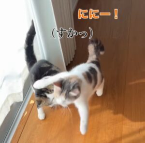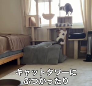キャットタワーやコードなどの障害物があると難しいようで、何もない場所で挑戦しても、なぜかつくねちゃんを通り過ぎてしまいます。なかなかうまくいかない様子のしらたまちゃんでした。