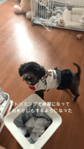 バグちゃんの性格について、@bugzamraiさんは「お転婆で、甘えん坊さんです。パパのことが大好きで、行くところすべてについて行き、外出すると寂しそうに鳴いてしまうほどの甘えん坊でもあります」と話します。今では先住犬よりも存在感を見せるようになったのだとか。