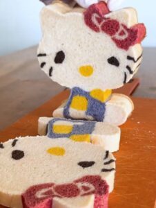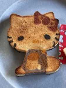 完成したキティちゃんの食パンは、とてもかわいらしい仕上がりに。焼く前は赤や青が映えるカラフルな姿でしたが、トーストするとこんがり色づき、まるで日焼けをしたかのような雰囲気に変身。どちらの表情も魅力的ですね。