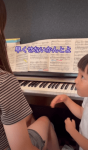 動画には、弟くんが楽譜や鍵盤を指さして「もちょっとさー もちょっと ここらへんとかさ はやすぎ ゆび」などと指摘する姿が映っています。