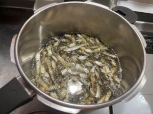 夜はラーメンの予定だったそうで、煮干しスープを朝から作っていた息子さん。