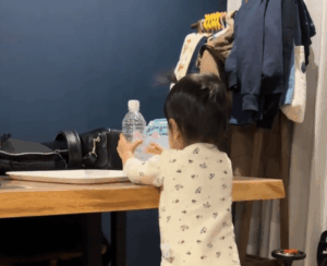 まだご飯を運ぶのは難しい年齢のため、弟くんはペットボトルをおぼんに乗せて練習。