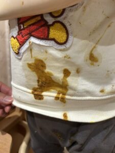 家族で夕ご飯のスープカレーを食べていたときのこと。片付けをしようと、1歳9ヶ月の息子さんを椅子の上に立たせたところ、洋服に見慣れないシミを発見しました。
