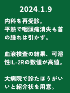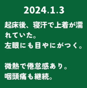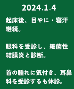 1月3日の朝には寝汗で上着が濡れるほどになり、その後、微熱や咽頭痛、倦怠感も出現。4日に眼科を受診し「細菌性結膜炎」と診断されましたが、その際に首の腫れにも気づきます。