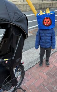 その後、お面をかぶったままの息子さんは、帰り道ですれ違う人たちに向かって挨拶を開始。