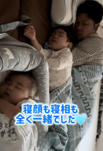 当時を振り返り「朝起きてまだ私以外は寝ていたので、ふと横を見てみたら同じ体勢で寝ていました」と話すママさん。