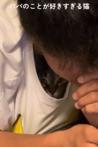 わさびちゃんはとにかくパパさんのことが大好きで、家の中でも常にあとをついて歩くそうです。寝転べばお腹の上に乗り、座れば膝に座り、ゆったりしたTシャツを着ていると脇やお腹から入り込むのだとか。