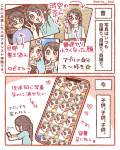 カメラロールも、かつては自撮り写真で埋め尽くされていたのに、今では同じアングルの子どもの写真がずらり。ほとんど同じ写真なのに消せない、といった母あるあるも描かれています。