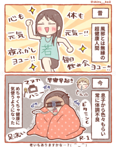 さらに、昔は風邪とは無縁だった健康体が、今では息子からいろいろ“もらい”、常に体調不良気味……という変化もユーモラスに表現されていました。