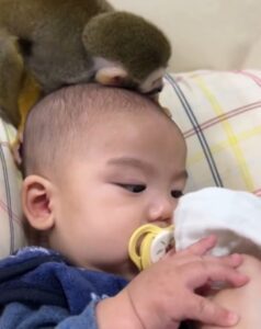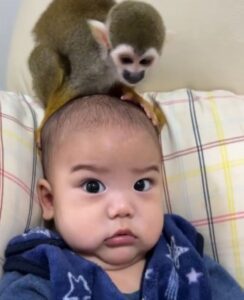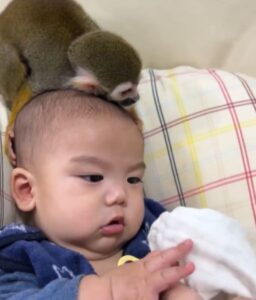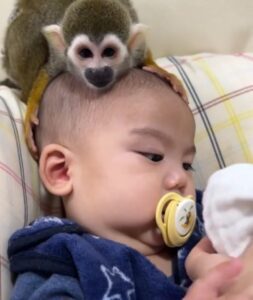 今回はお子さんの頭上に、リスザルのピピちゃんと一緒にいる様子がカメラに収められていました。