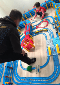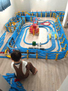 完成したレールを息子さんにお披露目すると「わあ!」と歓声をあげて大喜び。すぐに電車を走らせて遊び始めたそうです。
