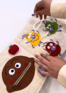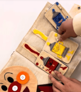マジックテープでペタペタ貼って遊べるシンプルな仕掛けから、ボタン外しの練習などレベルアップ要素も。