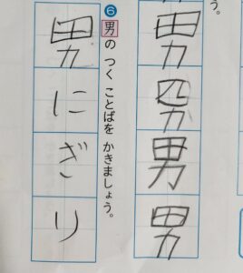 ドリルには「男」という漢字の練習が並んでいます。