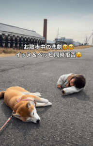 問題が起きたのはコースの折り返し地点。つくねちゃんがいきなり地面に寝転がり、歩くのを拒否し始めます。