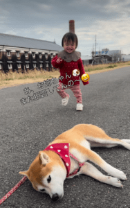 今回話題になっていた動画に登場するのは、1歳3ヶ月の娘さんと、4歳の柴犬・つくねちゃん。撮影当日は、いつもの河川敷コースを散歩していました。