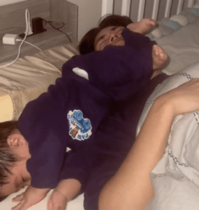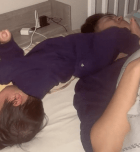 息子さんは遊んでいるわけではなく、深い眠りの中で無意識に動き回っており、まさに寝ながらのドロップキック状態となっていました。