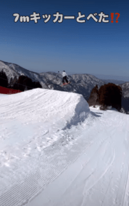 スノーボードで7mのジャンプ台を飛び越えたり、パイプなどの上を滑る技を決めたりと、軽やかな滑りを見せています。安全に配慮した装備を整え、楽しみながらも真剣に練習に励んでいることが伝わりますね。