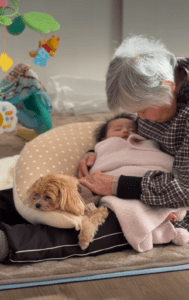 赤ちゃんは気持ちよさそうに眠り、そのそばにはおばあちゃんと愛犬のちゅらみちゃんの姿がありました。