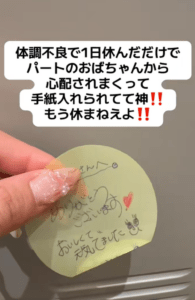 体調が回復し、出勤日にロッカーを開けると、中には手紙とお菓子が入っていました。手紙をくれたのは、パートとして働くスタッフのみなさんでした。