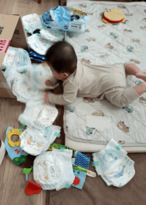 ママさんが急いで様子を見に行くと、そこには紙おむつの箱をひっくり返し、中身をあたり一面に散らかした息子さんの姿が。