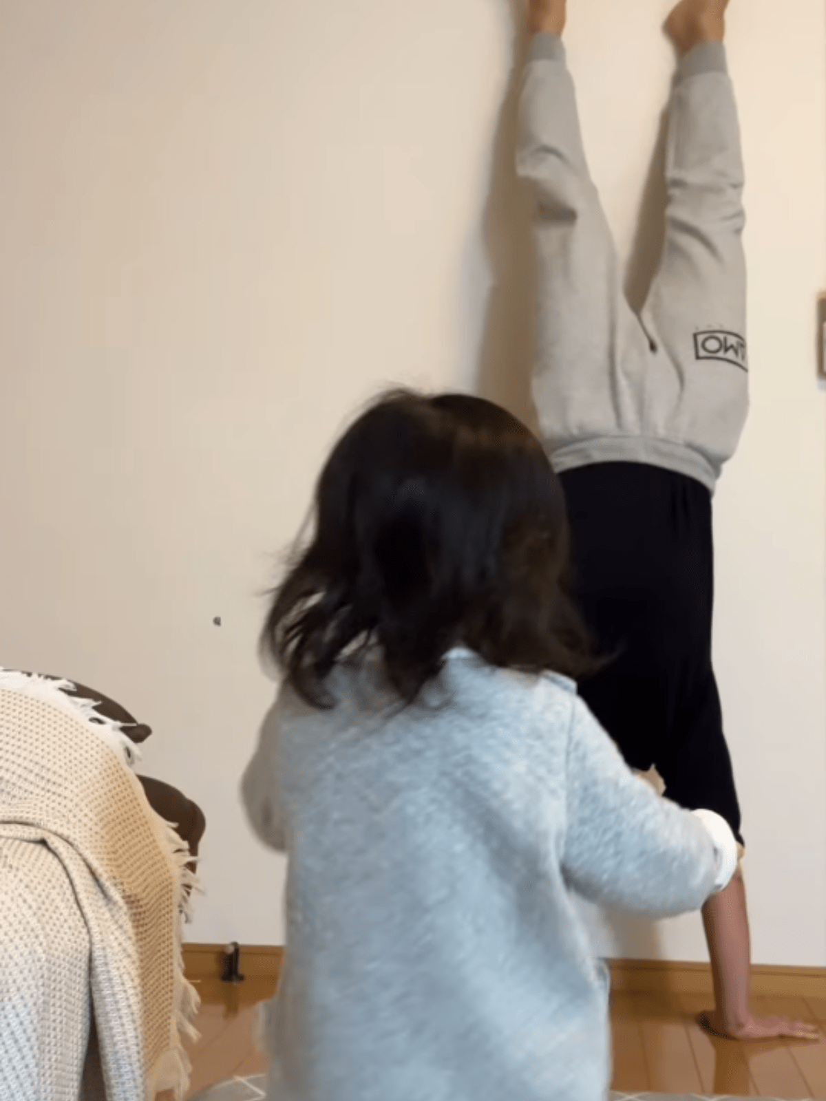 はじめて逆立ちを見た1歳娘。人生1周目すぎる反応に「可愛すぎて涙でた」「反対だよって言ってる」