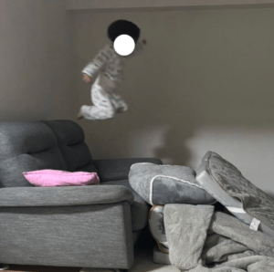 おばあちゃんから送られてきた写真を見たママさんは「宙に浮いちゃってるじゃん…まだ寝ないな」と冷静に受け止めたとのこと。