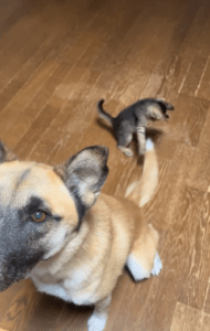 愛犬のしっぽを見つめる子猫