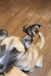しばらくすると、リノくんはゆうとくんのしっぽを猫じゃらしのようにとらえて遊び始めます。