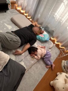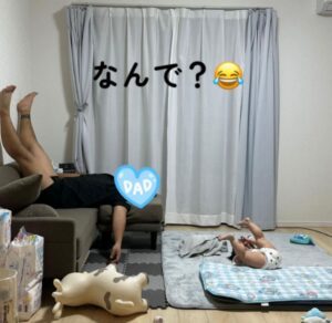 ふとリビングに目を向けると、ソファではパパさんが寝そべりながら足を上にあげ、床では娘さんも同じように寝転びながら足を上げていました。さらに、パパさんと娘さんの周りにあるおもちゃたちも、全てひっくり返ってま
