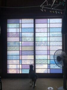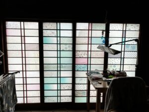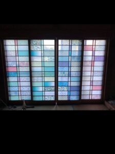 100円ショップで布を探していると、かわいらしい柄の手ぬぐいを発見。特にデザインにこだわることなく、さまざまな手ぬぐいやハギレをランダムに貼り付けていった結果、障子戸はまるでステンドグラスのような美しい仕上がりになりました。