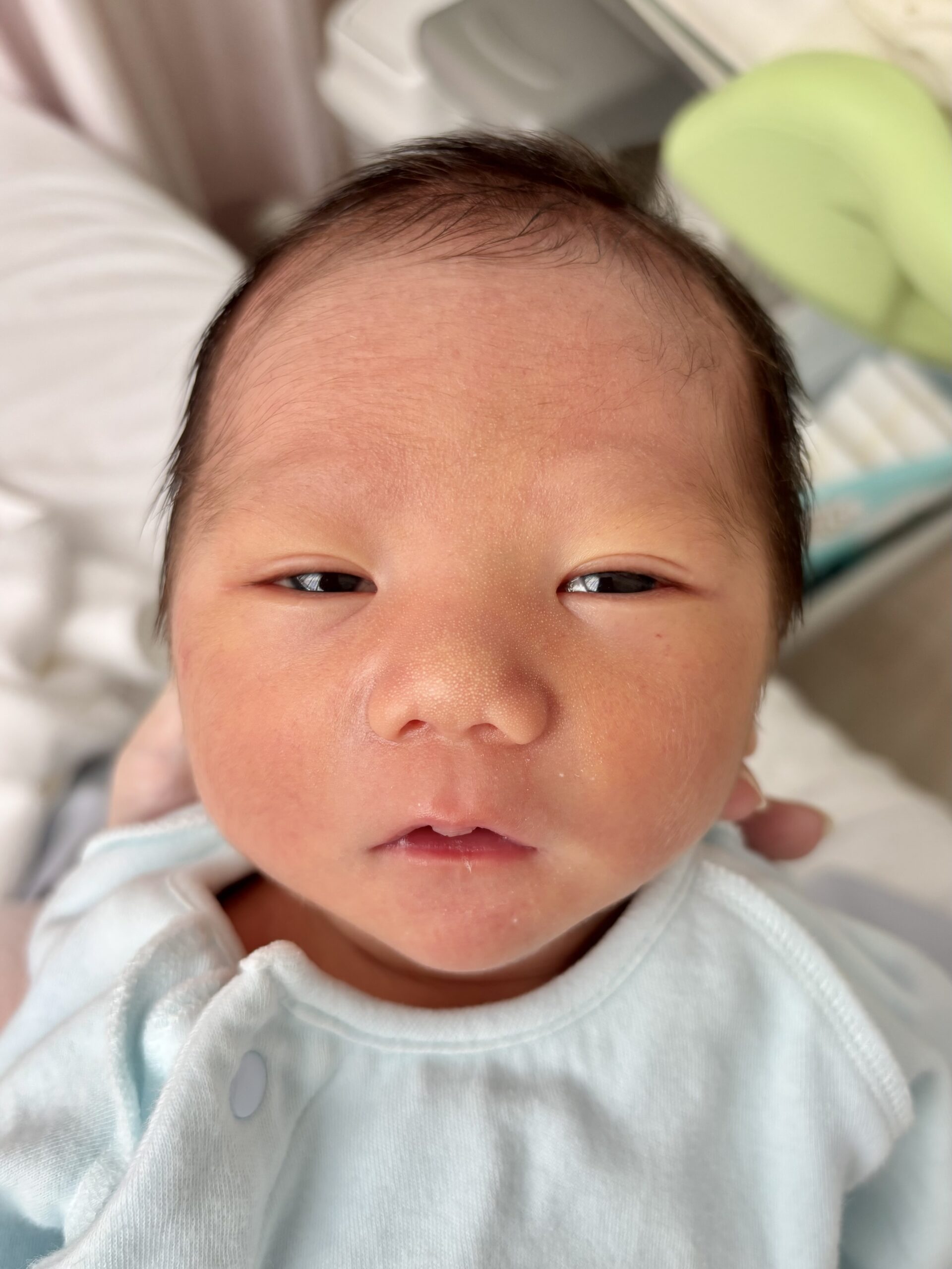生まれた直後、パッチリお目目だった赤ちゃん。5ヶ月後、現在の様子に「ご利益ありそう」「イケメンになりそうなお顔!」