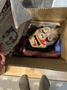 数日後、サツマイモを使おうと段ボールを開けたママさんは、思わず声が出てしまうほど驚きます。中には、なんともインパクトのある“驚くような表情のお面”が入っていたのです。