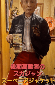 おじいちゃんの装いは、半袖のアロハシャツやスカジャンを着た遊び心のあるスタイル。