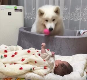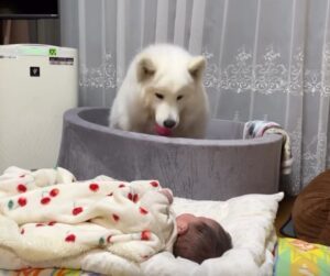 生後3ヶ月の娘さんが布団で横になっていたときのこと。すぐそばには、サモエドのアイスちゃんの姿がありました。