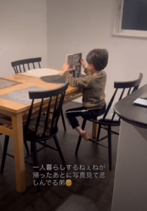 ある日、夜ご飯を食べ終わった後のこと。弟さんはダイニングテーブルでお姉さんの写真を見つめていました。