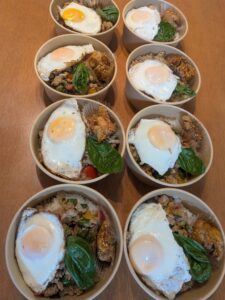 今回の8人分のお弁当では、まず衛生面に配慮。本来は半熟にする目玉焼きも、しっかり火を通して食中毒対策を徹底しました。