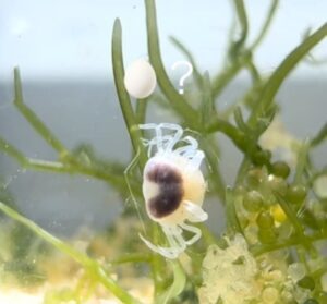 オスとメスを水槽に入れてみたところ、メスのお腹には卵が確認されました。黒い粒のように見える卵ですが、数日後にはなくなっていたとのこと。