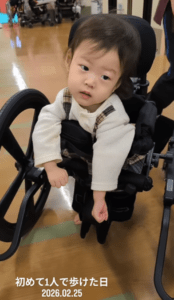 初めて立つことができた日、これまで想像もできなかった姿に、思わず涙があふれた@nipemado.1997さん。歩くことは夢のように感じていたものの、練習を重ねる中で、足を一歩前に踏み出す姿が見られるようになりました。