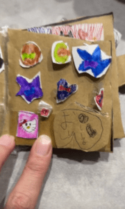 紙やペン、綿、段ボールといった身近な素材を使いながら、シールを手作りしました。