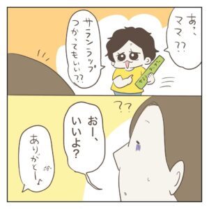 ママさんが「先に食べておいて」と声をかけると、一度その場を離れた息子さん。しばらくするとラップを手に戻ってきたといいます。